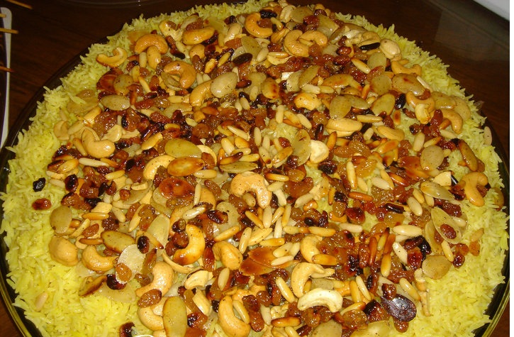 Wash your rice ans soak it in water. In your pan add some margarine and saute the turmeric, cinnamon stick, bay leave, cloves and cardamon. Add your chicken stock, saffron and some more margarine. Add the rice, cover with the led and leave it on high heat till it boil and soak most if the stock. Lower your heat and leave your rice to cook slowly. In another pan, add all your nuts and raisins with some margarine, season with a pinch of salt, cinnamon, nutmeg and black pepper. Toast your nuts till golden.